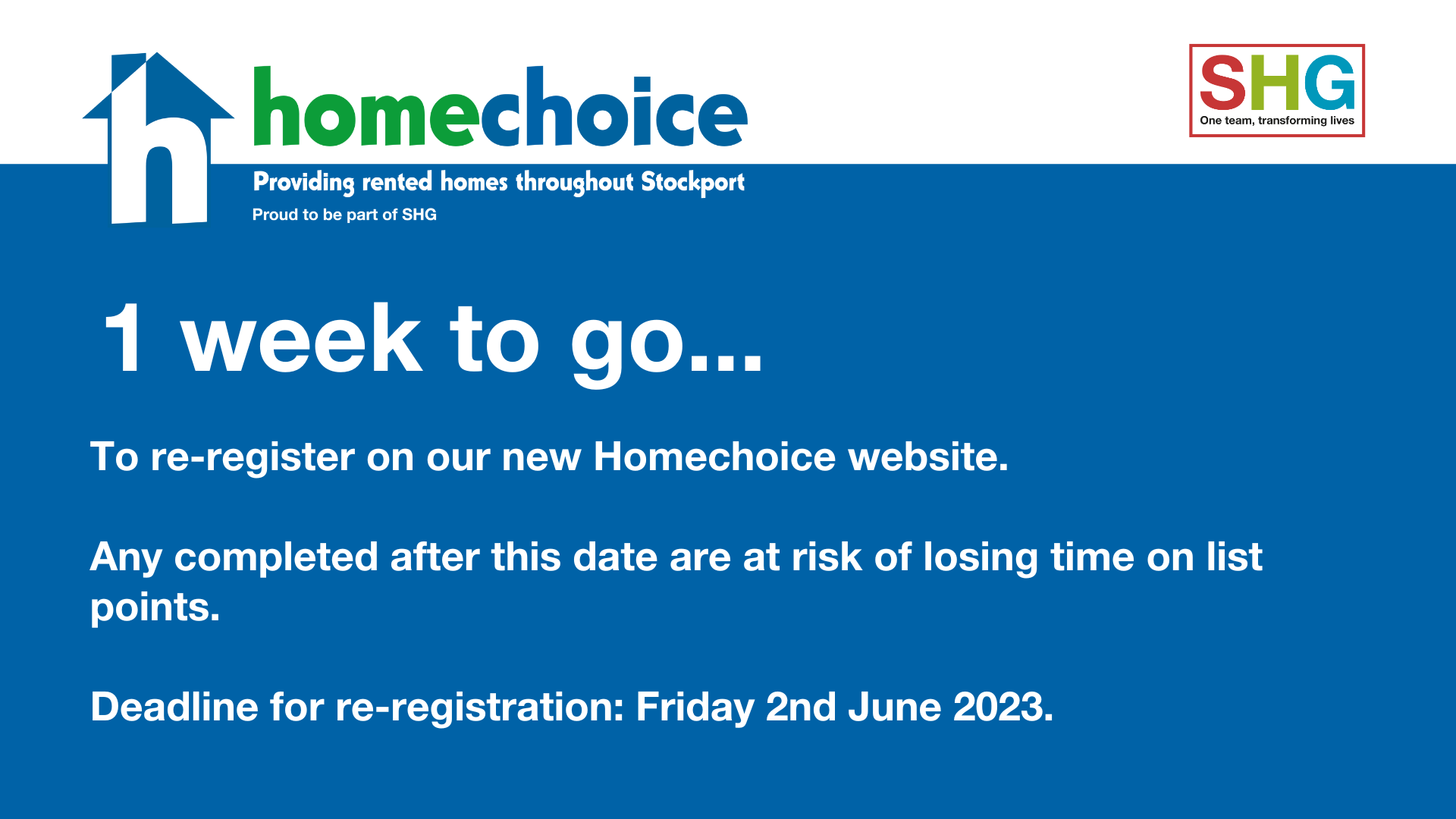 In order to be set up on our new system, which goes live on 21st June, current applicants will need to register on our new website and complete a new Homechoice Application Form. You will have received an email or letter with details, including your current application reference.